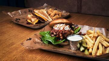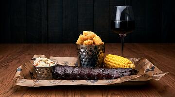 Tre nya Ribs 'n' Burgers by Texas Longhorn på ett bräde
